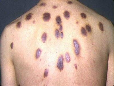 - Традиционная саркома Капоши. Данная форма проявляется образованием на коже нижних конечностей, стоповой части и ладонях рук пигментных пятен синюшного или красного цвета с неровными краями и гладкой поверхностью. На последующих стадиях данные образования утолщаются, сливаются между собой, начинают выступать над общей поверхностью кожи. При запущенном состоянии на образованиях появляются язвы.
